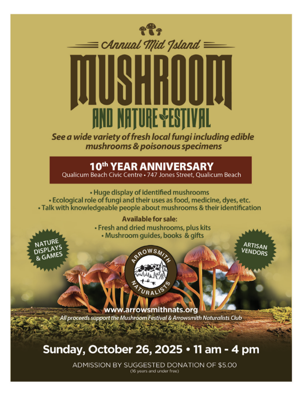 To learn more about local mushrooms, be sure to catch the Mushroom and Nature Festival on Sunday, October 26, 2025, 11am-4pm, at the Qualicum Beach Civic Centre. Click here to see poster with details.
